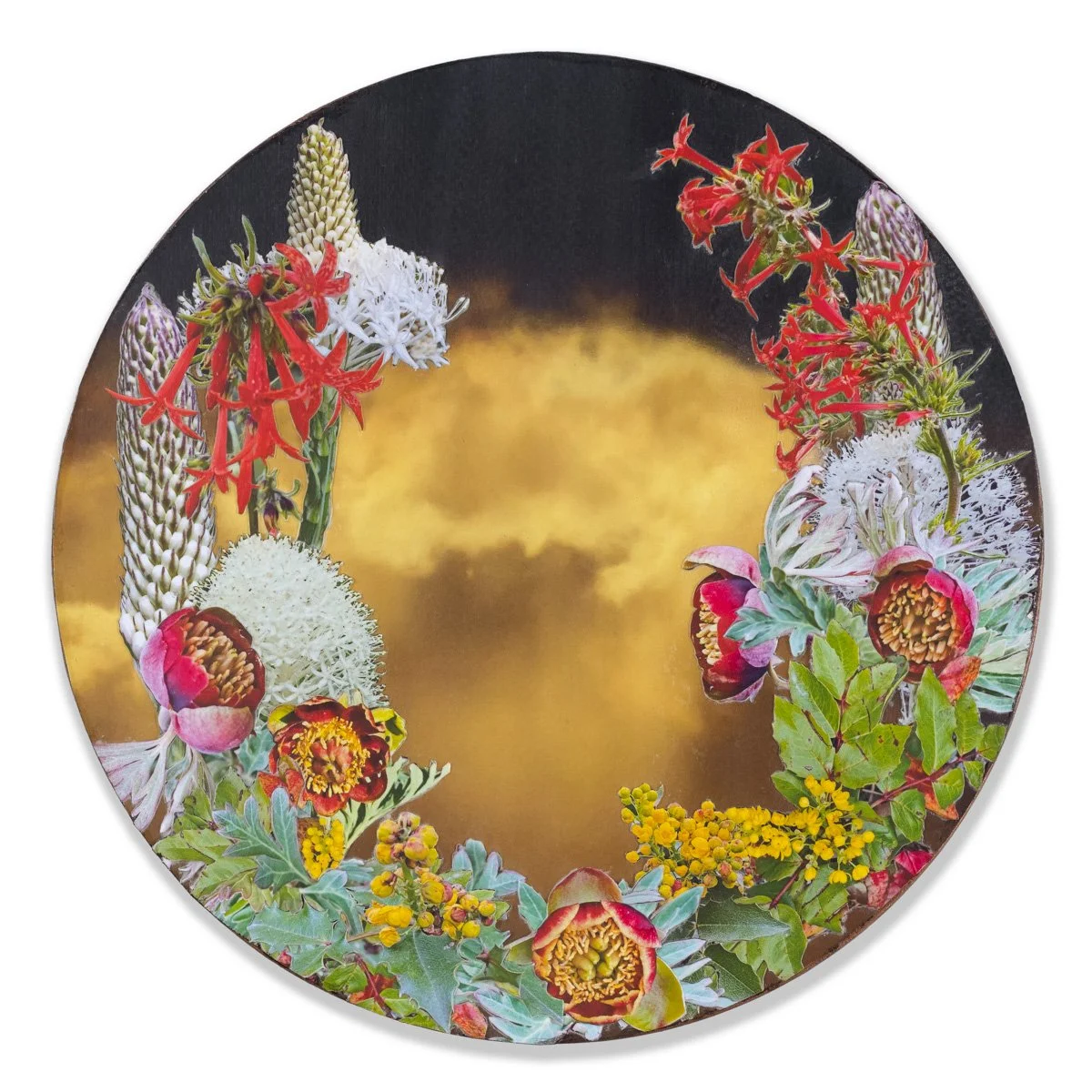 Summer Storm Peony: Photo collage using photos by the artist, including the sky. Each “plant portrait” is cut and placed into the collage. Mounted on cradled 10” round and ready to hang.